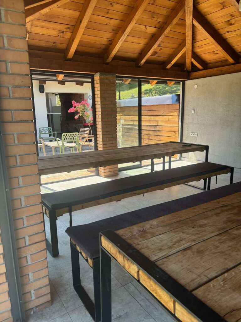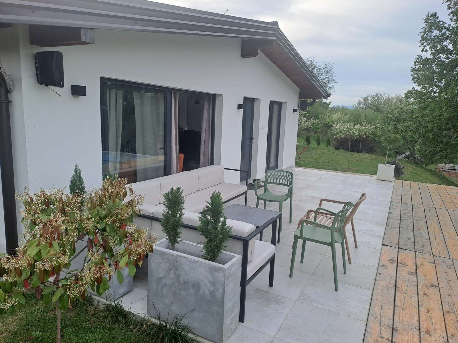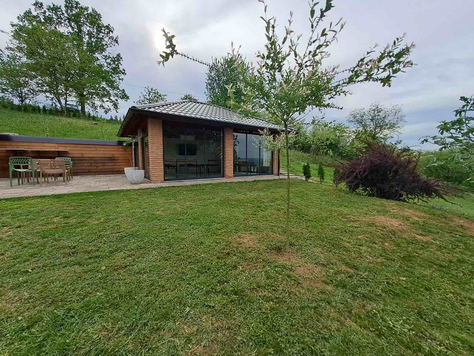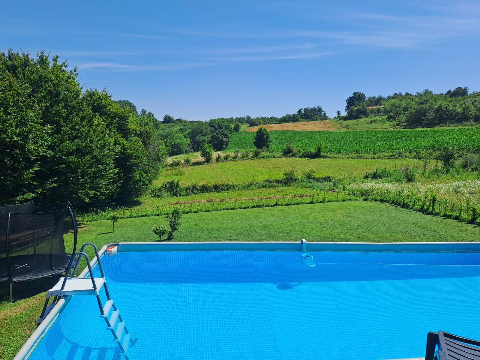 Dvorište je potpuno uređeno, sa montažnim bazenom, dječijim igralištem i prelijepom terasom između vikendice i bazena.